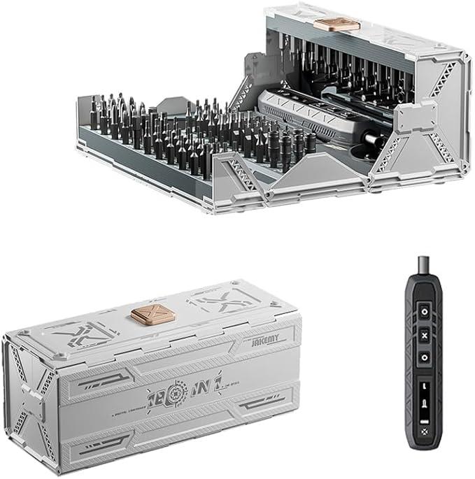 - 【WHAT WILL YOU GET】1*Automatic electric screwdriver+48*Precision bits+1*USB cable+1*Tweezers+1*Suction cup+4*Triangle+1*Card Pin+1*Common crowbar+1*Metal crowbar+1*15cm nylon long crowbar+1*Magnetic worktable Pad+1*Magnetizer device+1*User Manual+1*Aluminium outer box
