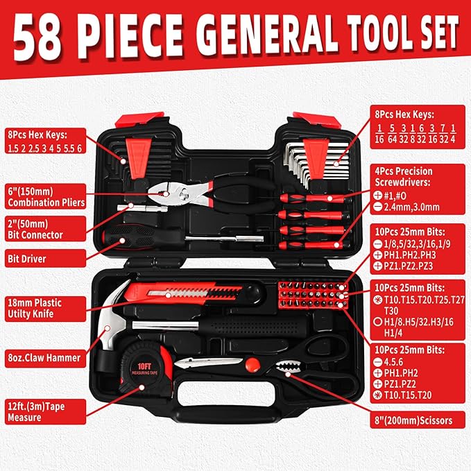 - SMALL TOOL KIT: This 58 piece home Tool Set is an essential tool set for daily home project and maintenance like furniture assembly, picture hanging and general purpose repairs, apartment, dorm room, or garage and automotive needs