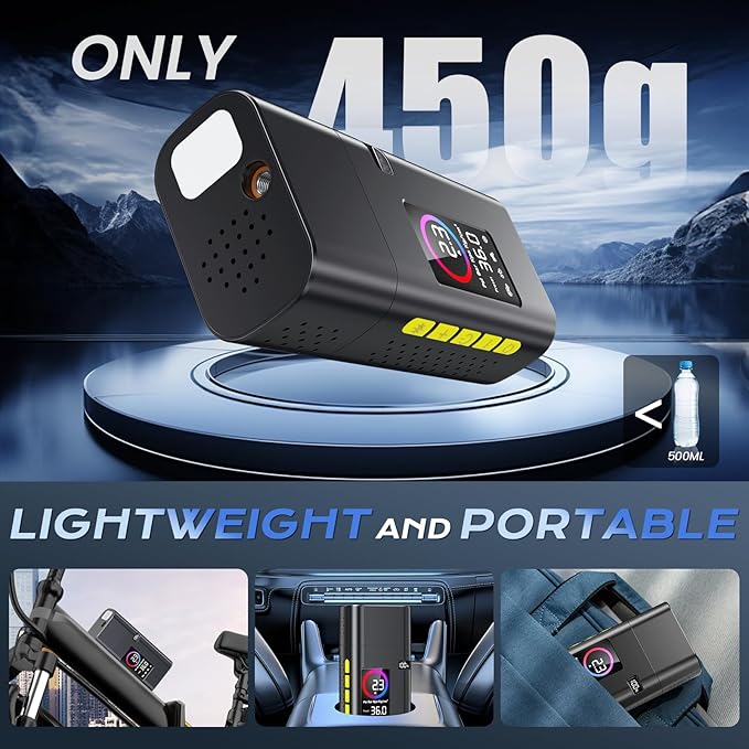 - โค๐๐ฅ๐ญ๐ซ๐-๐ฅ๐ข๐ ๐ก๐ญ๐ฐ๐๐ข๐ ๐ก๐ญ: The portable air compressor for car tires is equipped with a high precision alloy cylinder, which allows your tyres to be inflated quickly. Maximum tire pressure gauge is 180 psi / 12.3 bar, no time-consuming manual inflation is required. With a weight of only 450 g (size: 13.5 x 4.6 x 9 cm), it is so compact and lightweight in a minimalist design that it easily fits in your bag, bicycle rack, backpack and car, built for your travel.