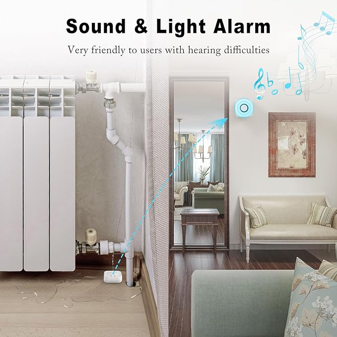 - Friendly Feature: When a water leak is detected, the water sensor and gateway sound a 110dB alarm and flash blue lights, ensuring individuals with hearing loss won't miss the warning even in the dark.Even if you are not at home, you can still receive any alarm notifications