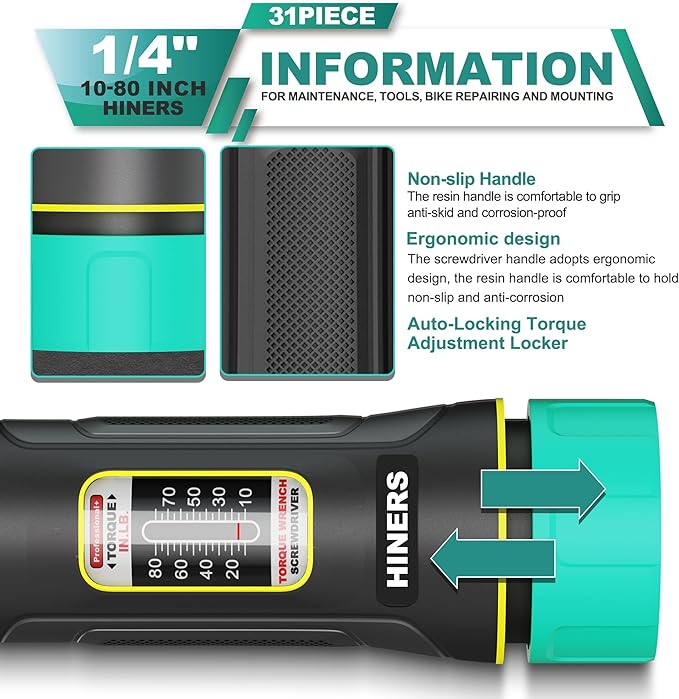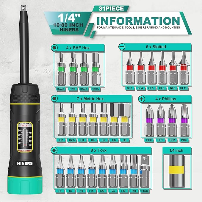 31 Piece Torque Screwdriver Wrench Driver Set 1/4" 10-80 Inch Pounds lbs with 30pcs S2 Bits, Long Shank Screwdriver Torque Wrench for Maintenance, Tools, Bike Repairing and Mounting