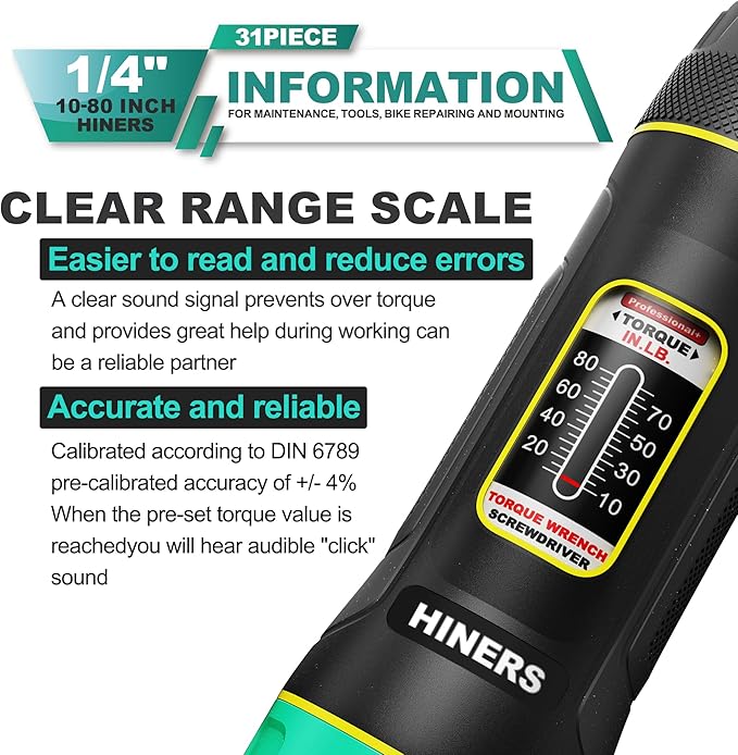 - Accurate and reliable: Calibrated according to DIN 6789, pre-calibrated accuracy of +/- 4%. When the pre-set torque value is reached, you will hear audible "click" sound