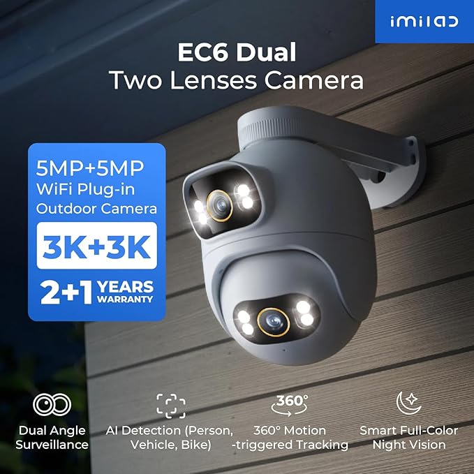IMILAB EC6 Dual 3K+3K Plug-in Outdoor Security Camera: Outdoor Camera for Home Security w/Motion Spotlight/Siren, Wired 360° Rotate Cam, Person Tracking, 24/7 Continuous Recording, Color Night Vision