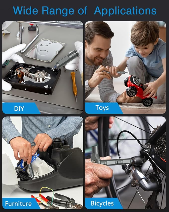 - 【Multi-Functional Handle】The multi-functional handle serves as both a screwdriver and a small wrench, offering seamless switching and multiple functions for versatile applications. It can efficiently handle various tasks, including home appliance repairs, power tool usage, and automotive maintenance. Additionally, the handle is equipped with a powerful magnet that securely holds the hex bits, and a built-in magnetization chamber adds magnetism to the bits anytime, ensuring convenient use and portability