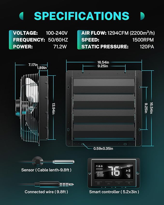 - Smart Thermostat: Equipped with a smart controller, our 14 inch exhaust fan with thermostat allows for precise temperature and humidity management. Set up to 10-level speeds and 9-hour timer to automatically adjust based on environmental changes, ensuring optimal ventilation and energy efficiency.
