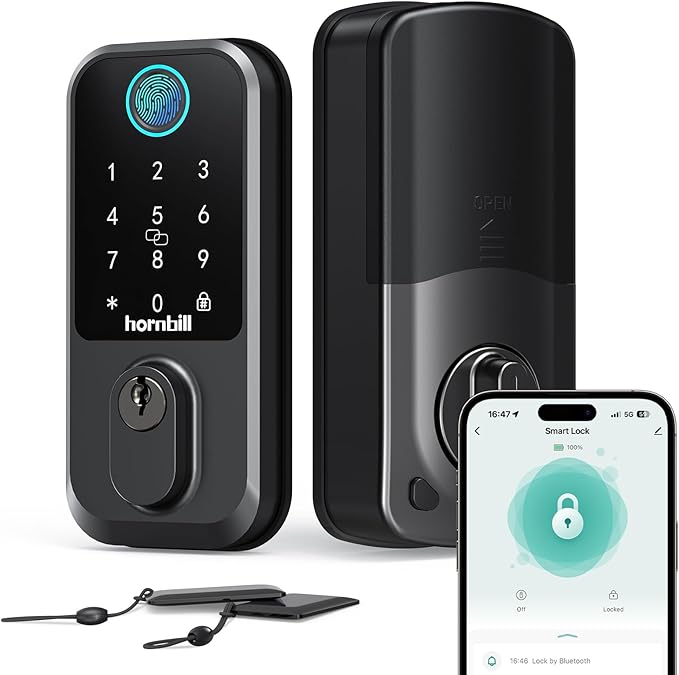 Keyless Entry Wi-Fi Smart Lock: Hornbill Fingerprint Lock for Exterior Doors, Biometric Smart Deadbolt Locks for Front Door, Keypad Deadbolt with Auto-Lock for Rentals Home, Matte Black