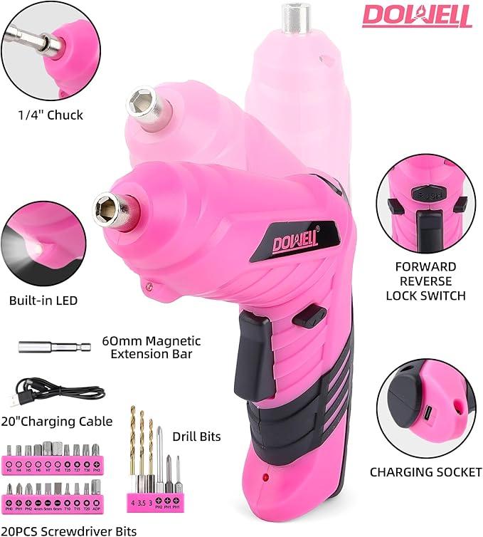 DOWELL 116Pcs Pink Tool Kit with 3.6V USB Cordless Screwdriver, Small Drill Set for Women, Girls