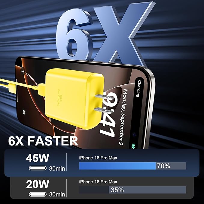 - 【45W Phone 16 Pro Max Charger Fast Charging】:The 45W Phone 16 Fast Charger USB C Block with 6.6FT extra long USB C to USB C fast charger cable cord provide Max 45W output power, charge your Phone 16 Pro Max up to 70% in just 30mins, 6X faster than the original 20W USB C charger