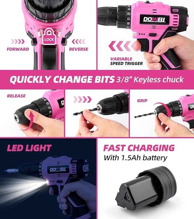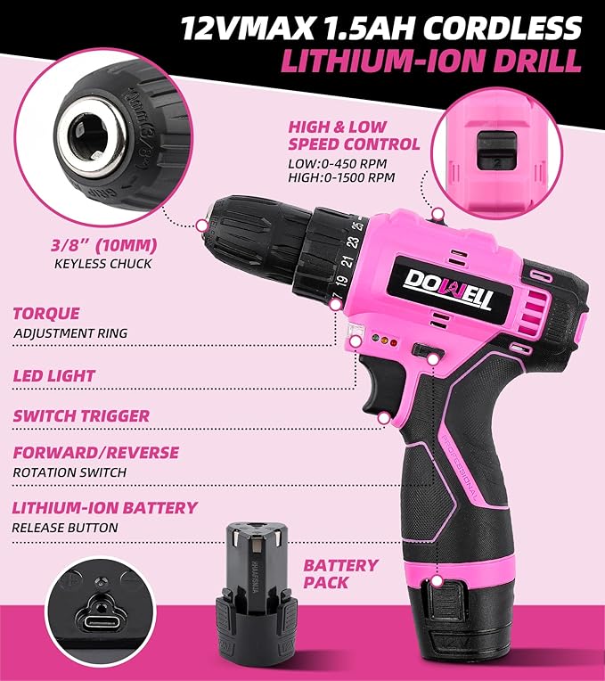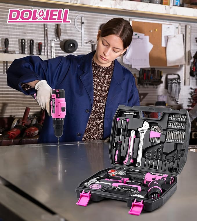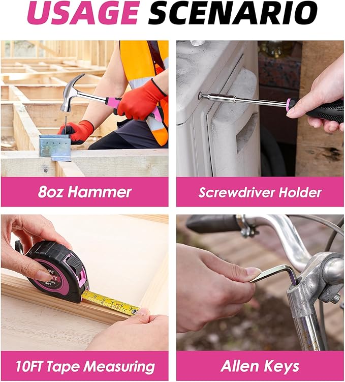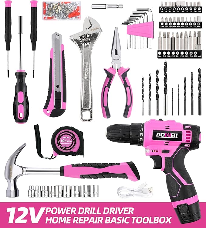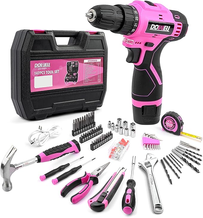 - 147-PIECE PINK TOOL KIT: Features a 12V cordless power drill paired with essential home repair gear, including a compact 8oz claw hammer, 8" adjustable wrenches, 6" needlenose pliers, safety-lock utility knife, 10-foot retractable tape measure, precision screwdrivers, magnetic hex key assortment, a magnetic bit holder and so on. This versatile assortment empowers DIY projects, craft upgrades, and emergency fixes with professional-grade versatility in a feminine-toned package.