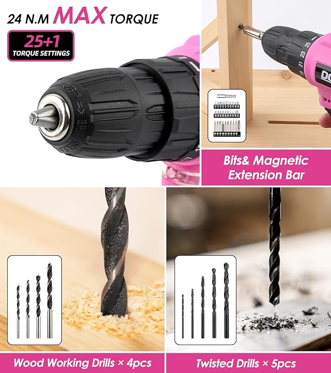 - 12V PINK POWER DRILL: Lightweight but powerful, cordless, 12V motor, equipped with built-in 1300mAH rechargeable lithium-ion battery that can last 2-3 hours, a bright LED to light up work areas. 25+1 position clutch setting provides precise control for drilling into wood, plastic and screw driving tasks. Variable speed(0-1300RPM)with electric brake function provides precise operation.