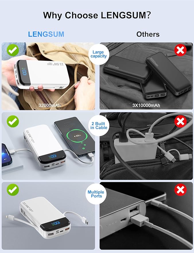 - 32000mAh Huge Capacity: Our 32000mAh portable battery using the new high-density polymer battery, it has a larger capacity under the same volume. perfect for a business trip or on the go, you don't have to worry about your phone low battery; Power bank built in cable with LED display shows the remaining battery, and the low power remind will let you know when need be recharged.