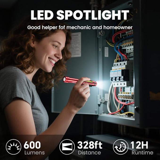 - 【600 Lumen Dimmable Modes for Precision Work】Switch between 8 modes: High (600 lm, 6hrs) for engine bays, Low (150 lm, 12hrs) for night shifts, Red Light for medical checks, and Strobe for emergencies. 50% brighter than standard pen lights.