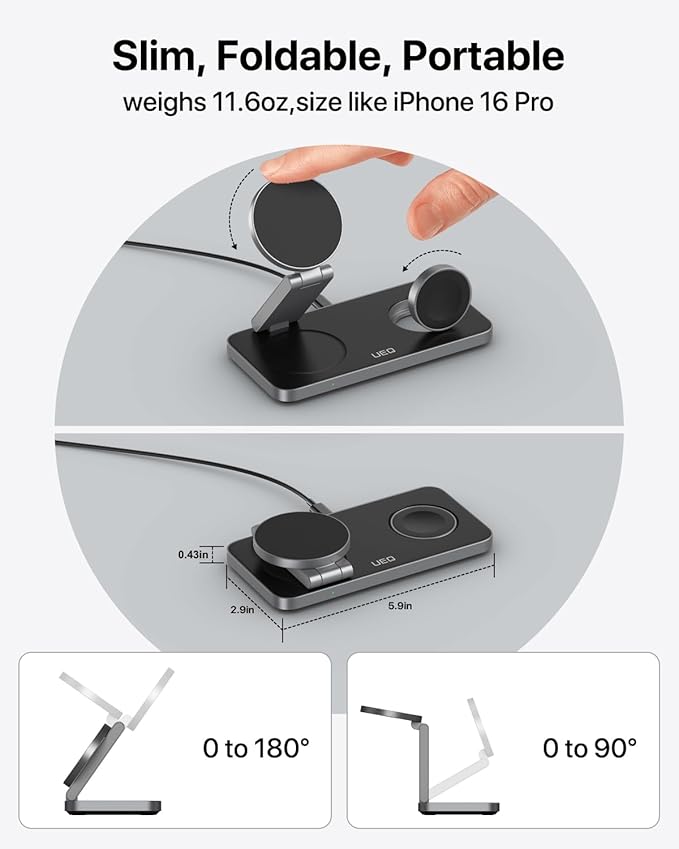 - 【Adjustable and Space-Saving】 Featuring a foldable, slim, space-efficient design with angle-adjustable phone and watch charging modules,this mag-safe charging station allows you to find better viewing angle. Also this foldable charger’s compact size makes it perfect as travel charger. The stable heavy base and anti-slip bottom pad ensures you can remove your iPhone with one hand without it tipping over. Ingenious structure design makes it won’t block your iPhone’s camera while charging.