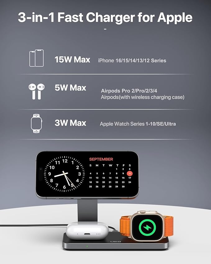 - 【3-in-1 Charging station for Apple Devices】This fast 3 in 1 magnetic wireless charger can power your iPhone,Apple watch and AirPods simultaneously. It'll fully charge iPhone 16 and Apple Watch S10 in just about 1.5-2.0 hours(other non-applle brand need 3.5 hours).The mag-safe charger stand only suitable for iPhone 16/15/14/13/12 series,for Apple watch S10/9/8/7/6/5/4/3/2/SE/Ultra 2, AirPods Pro,Airpods 2/3(with wireless charging case). Note: For optimal charging of this wireless charging station, please use the provided 20W USB-C wall charger.