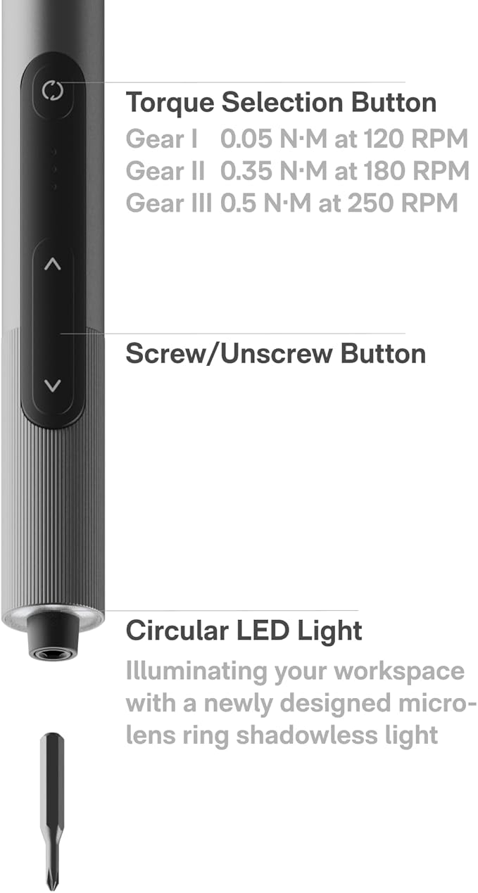 - Precision Torque Control: Three intelligent presets (0.05 N·m/ 0.35 N·m/ 0.5 N·m) with auto-stop protection prevent over-tightening damage. Effortlessly tackle delicate electronics repairs – perfect for M3 screws in laptops, smartphones, and eyewear