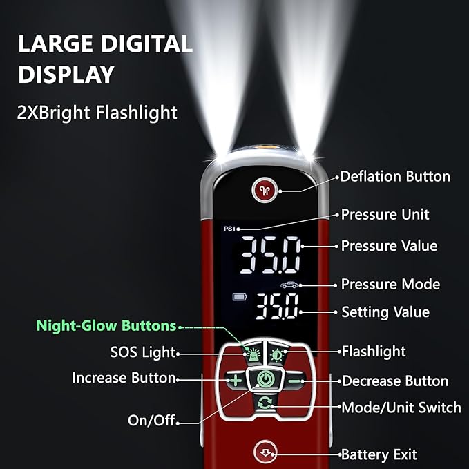 - FAST & ACCURATE INFLATOR/DEFLATOR-The portable tire inflator with large dual-value screen boasts a 2X faster metal motor, delivering 30L/Min airflow for inflating a 215/55 R17 small car tire (28-35PSI) in just 56 seconds. The integrated air pressure gauge ensures inflation accuracy to within 1%,while the deflation function adapts to various conditions like muddy terrain, deserts, snowy areas, off-roading, and heavy loads.(Not for trucks and paddleboards)