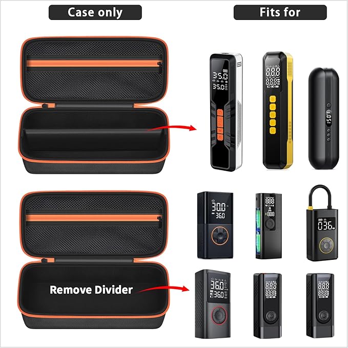 - Flexible Storage for Hajomel Air Compressor Cover: Tire pump for car box is designed with detachable divider inside, allowing for flexible organization. This design enables you to adjust interior space according to size of car air pump and air inflator tube, effectively preventing friction and collision between them, ensuring that each item is in a safe condition. Divider is sturdy and durable, capable of withstanding detach repeatedly without deforming.