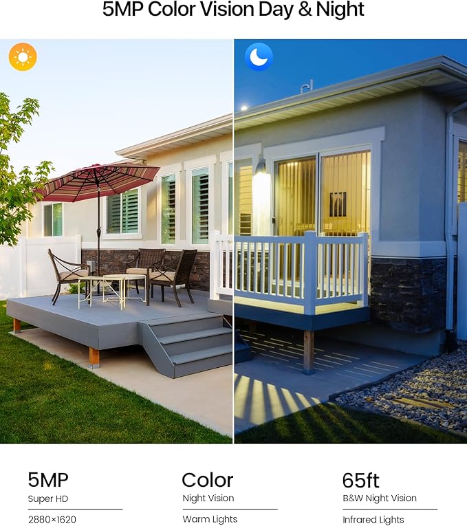 - (2). [ 3K 5MP HD & Color Night Vision ]__ Capture every detail with stunning 5MP clarity, The package includes an 8-channel NVR with 1TB HDD for 24/7 recording and 4 X 5MP 3K IP66 weatherproof wireless cameras, which offer optional color night vision, providing vivid visibility even in low-light conditions, ensuring 24/7 comprehensive protection for your home.