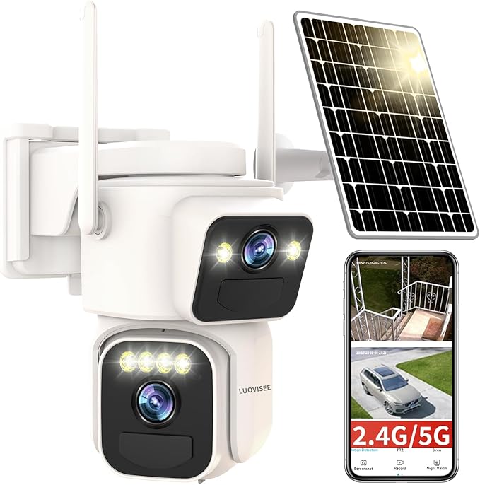 Solar Security Cameras Outdoor Wireless,2.4G/5G WiFi Cameras for Home Security, Dual Lens PTZ Motion Zone,2-Way Audio,Night Vision,Weatherproof,SD/Cloud Storage