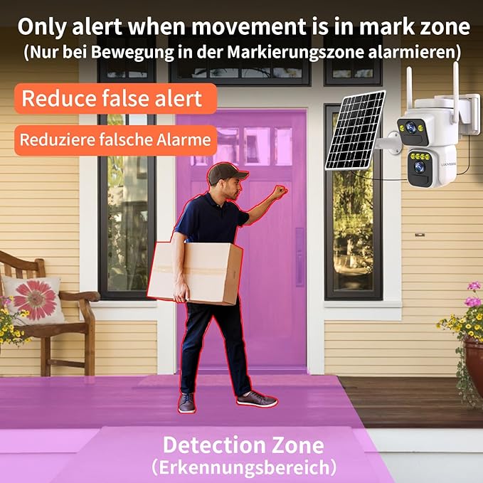 - 【1 Device = 2 Cameras,2*2K Ultra HD Resolution & Color Night Vision】Security Cameras Wireless Outdoor has two lens. 2 lens view cover 360°,Each lens is 3MP/2K with sharper colors and details, allowing you to see everything that is happening within your surveillance area. One camera but function as 2. The camera is built-in 8 leds, the light could be set to motion triggle on or always on at night or close,and when the lights are on at night, extraordinary color night vision adds a glow to every dark night.
