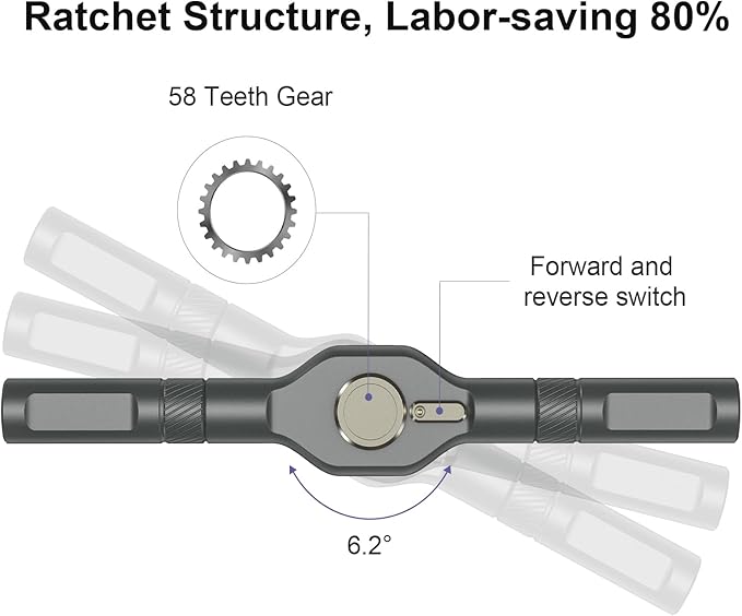 - Effort-Saving 58-Tooth Ratchet Mechanism – The high-performance ratchet screwdriver features a 58-tooth, 6.2° ratchet mechanism, reducing effort by 80% with a robust 50Nm torque capacity. Tighten or loosen screws effortlessly without constant wrist adjustments, saving both time and energy.