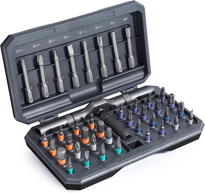 - Versatile Multi-Bit Screwdriver Set – This 42-in-1 screwdriver set includes 40 premium S2 chrome-molybdenum steel bits (1/4'' diameter) for superior durability. Featuring 32 short 25mm bits (PH, SL, Torx, Hex, PZ, U-shape) and 8 long 45mm bits, it’s perfect for home maintenance, DIY projects, bicycle repairs, and professional tasks.
