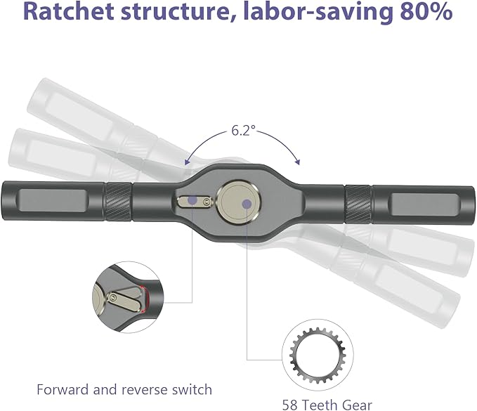 - Effort-Saving Ratchet Design: Featuring a 58-tooth, 6.2° ratchet mechanism, this ratchet screwdriver offers 80% effort savings with a 50Nm torque capacity, allowing you to easily tighten or loosen screws without wrist adjustments, saving time and energy.