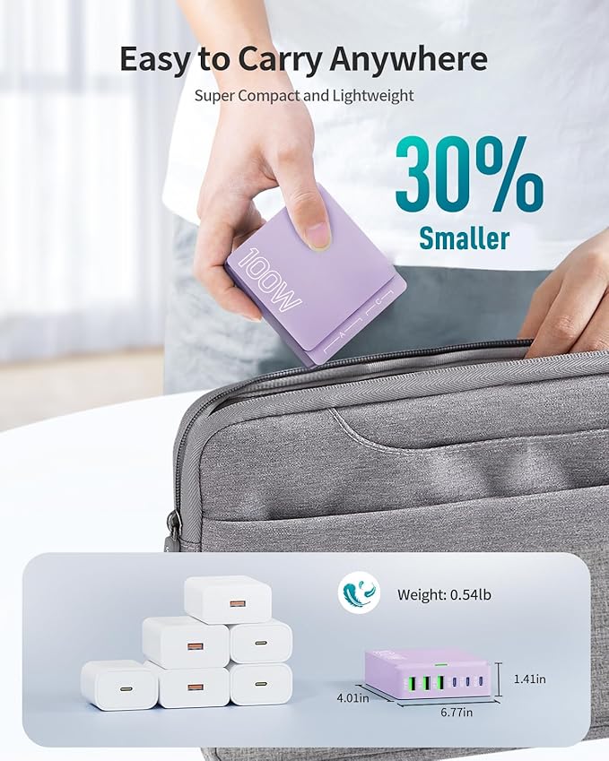 - 【Fast Charging】This product features 3 Type-C ports and 3 USB-A ports, with a total power of 100W. Only the Type-C ports support fast charging (max 20W per port), while USB-A ports do not (max 15W per port). Fast charging is limited to smartphones and tablets; older models may not be compatible, so check your device’s specifications first. A certified fast-charging cable is also required for fast charging with compatible devices.