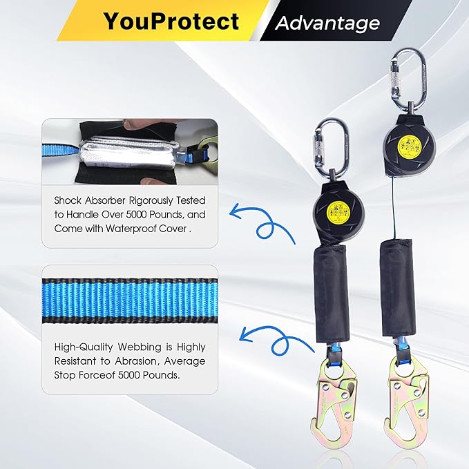 - EXTERNAL SHOCK ABSORBER:The lanyard shock absorbers, rigorously tested to handle over 5,000 pounds, If you stumble or fall, the shock absorber releases immediately, reducing acceleration and lessening the impact, drastically lowering the risk of harm or worse. This shock pack with protective cover on it to better preserve shock pack