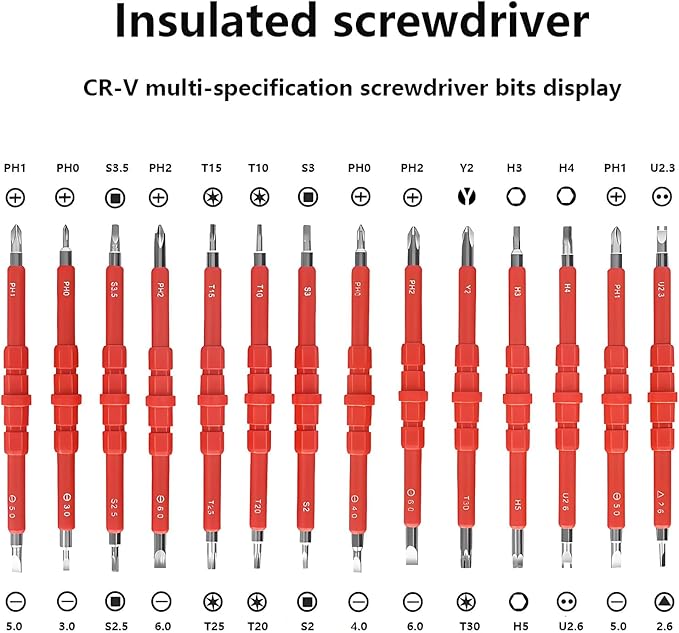 - 【Design】The screwdriver and handle are also insulated. The ergonomic handle helps you use it easily, ensures maximum grip and comfort during long-term use, and prevents the screwdriver from slipping.