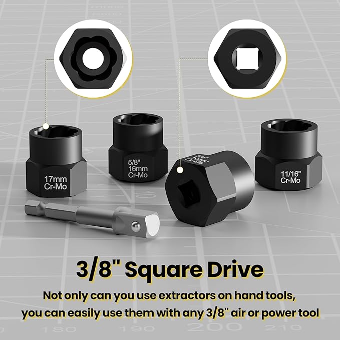 - BOLT AND NUT REMOVER: 13pc 3/8 Drive Nut Remover including sizes of 1/4"(6.35mm), 5/16"(8mm), 3/8”(9.5mm), 10mm, 7/16”(11mm), 12mm, 1/2”(12.7mm), 13mm, 9/16”(14mm), 5/8”(16mm), 17mm, 11/16”(17.5mm), 3/4”(19mm). You can use a 3/8'' wrench or a power tool to pull out broken bolts by selecting the appropriate extractor