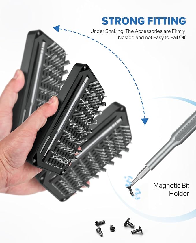 - Bearing Steel Bits: All precision bits are made of the best Bearing Steel and the hardness can reach over HRC65°, resist abrasion, oxidation and corrosion, ensure long time use. In addition, the strong magnetize-able tip easily pick-up and hold screws, helping you handle all tiny screws