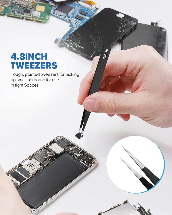 - 58 Precision Screwdriver Set :This precision bit set includes 56 of the most essential precision bits, a premium 4 mm aluminum screwdriver handle with magnetic socket, knurled grip, and swivel top—plus tweezers