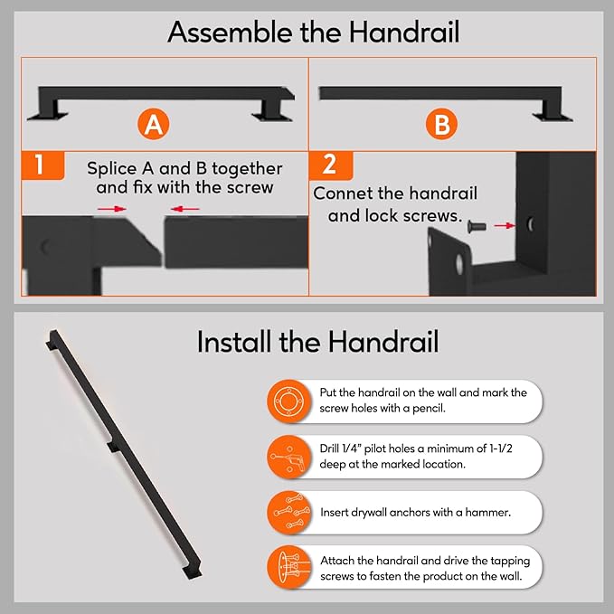 - 【Quick Installation】Install this modular square handrail by connecting sections with screws for custom lengths. Pre-drilled holes and included hardware make it easy to secure this railing for stairs to wood, brick, or concrete walls.