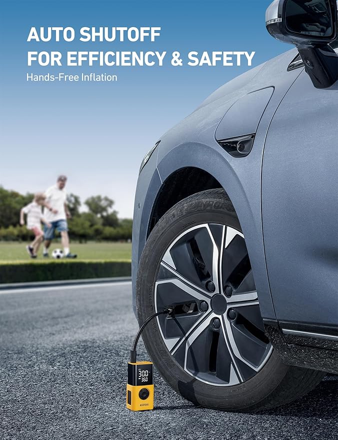 - LONG RUNTIME & AUTO-OFF: After fully charging, the built-in 4000mAh large-capacity battery allows the air compressor to refill up to 8 tires (195/65R15) from 30-36PSI. The preset function and auto-off function deliver a hands-free inflation experience. With just one press, the portable tire inflator will easily inflate car tires, motorcycle tires, bicycle tires, balls, and more. (Note: Incompatible with heavy-duty tires, like those on offroad vehicles, RVs, trucks, and trailers.)