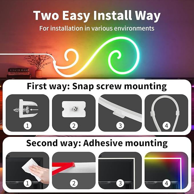 - 【5V USB RGB Smart IC Neon lights】 Compared with ordinary neon LED light strips, Our 16.4FT 5M USB RGB Smart IC neon rope lights have more densely distributed LED chips, which creates brighter, softer, spotless and ultra-even lighting glow. Not as spotty, suitable for lightening bright screens and easily cover the dark edges or area of a room.