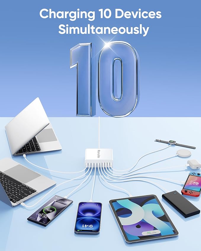 - 【10-Port USB Charging Station】 This USB C charger block from Roruite is the ultimate charging solution for multiple devices. Equipped with 6 USB-C charging ports and 4 USB-A charging ports, it offers a total output of 460W, allowing you to charge all your electronics simultaneously. Perfect for both home and office use, it saves you valuable outlet space and can support the charging needs of multiple people at once.