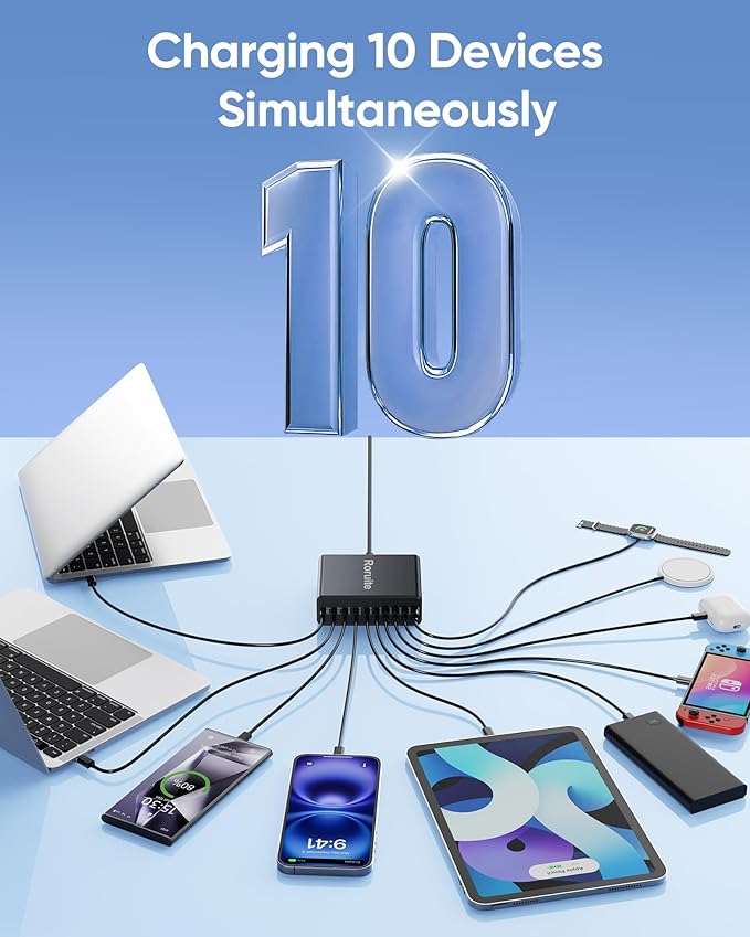 - 【10-Port USB C Charging Station】 This USB C charger block from Roruite is the ultimate charging solution for multiple devices. Equipped with 6 USB-C charging ports and 4 USB-A charging ports, it offers a total output of 460W, allowing you to charge all your electronics simultaneously. Perfect for both home and office use, it saves you valuable outlet space and can support the charging needs of multiple people at once.