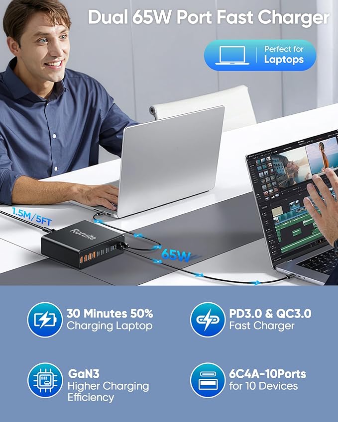 - 【6 Layers of Safety Protection】 The Roruite charging station uses advanced GAN III chip technology with built-in protection mechanisms for your devices. It includes 6 layers of safety features such as overheating protection, overvoltage protection, overcurrent protection, overload protection, overcharge protection, and short-circuit protection. This ensures your devices are charged safely and efficiently, providing peace of mind while you power up your electronics.