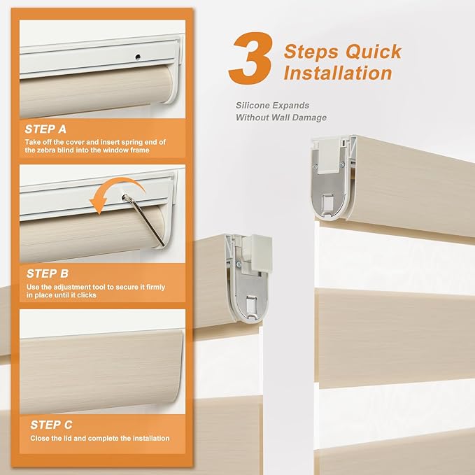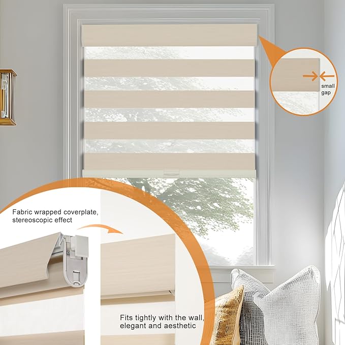 Persilux No Drill No Tool Custom Size Zebra Blind Dual Layer Privacy for Day and Night Window Blinds Light Filtering Cordless Windows Shades for Windows,Easy to Install Thermal Insulated Blinds,Beige