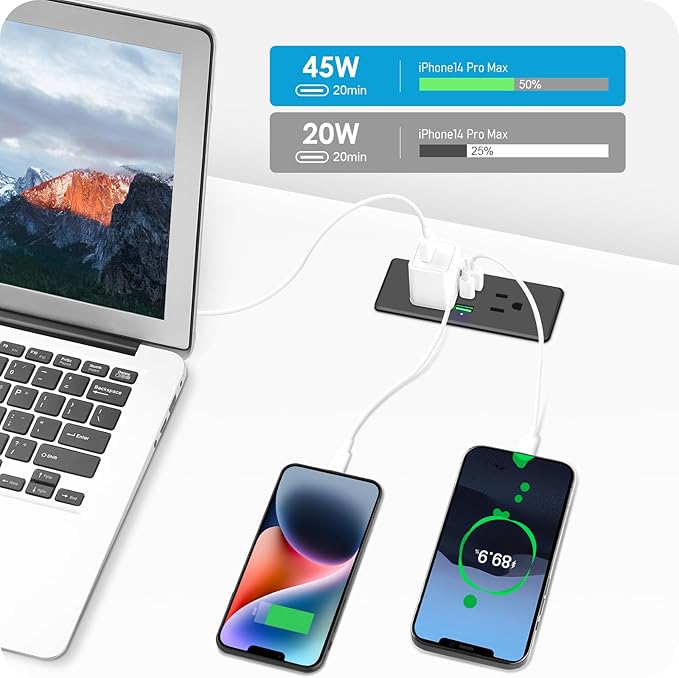 - 45W Fast Charging Power Strip: 2 Outlets Output rating 10 Amp / 125 Volt / 1250W. Come with fast charging QC 3.0 36W Max USB-A port and PD 3.0 45W Max USB-C port. Different phones, iPads, laptops, and many many other things and this has every single plug in one strip, USB, usb c, and standard plug. They charged fairly quickly too.