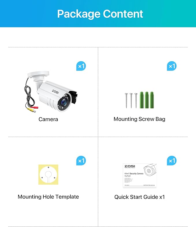 - (2). [ 1080p FHD Resolution ] __ This 1/3" CMOS 1080p bullet surveillance CCTV camera delivers crystal-clear video quality. It features 24 IR LEDs for powerful night vision up to 80ft, offering color footage during the day and black-and-white clarity at night. The 3.6mm lens provides a wide 90° field of view, ensuring excellent coverage depending on the installation environment.