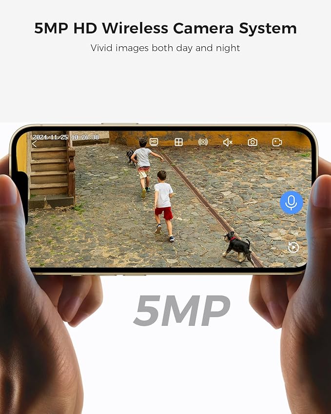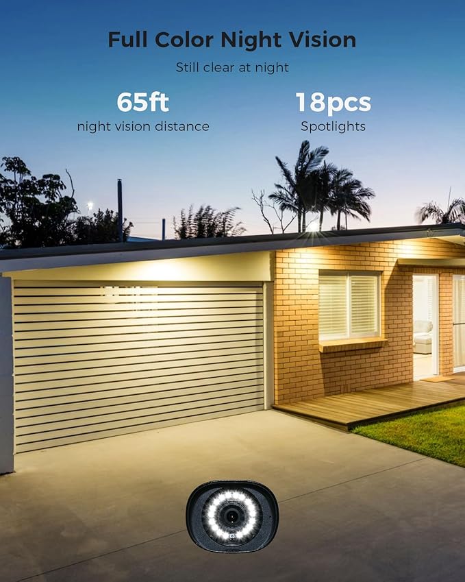 - 【Stunning 5MP Ultra-HD Video, Infrared Camera】The 5.0MP resolution provides 2560 x 1920 megapixels, offering clarity about 2.5 times that of 1080p. The camera features three array infrared LEDs, allowing you to see up to 65 feet in night vision, even in complete darkness. The outdoor security camera system also enables you to see and listen to people on your property remotely via the app.