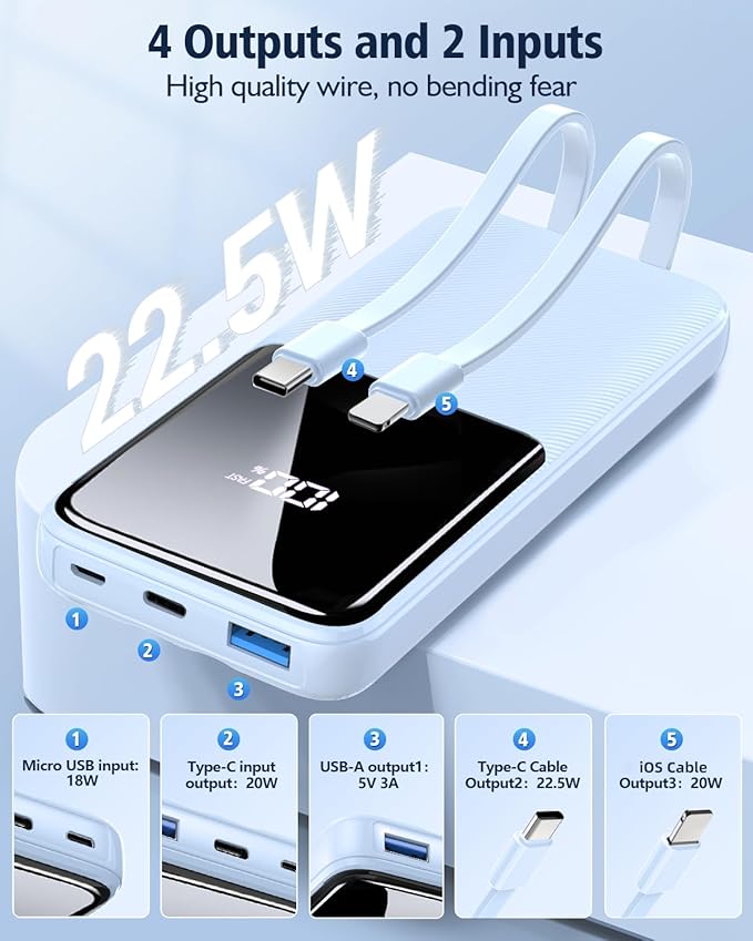 Portable Charger Power Bank - 20000mAh Fast Charging Portable Battery Pack with Built in USB-C(22.5W) and iOS(20W) Output Cables Compatible with iPhone Android Samsung Phone etc (1 Pack, Blue)
