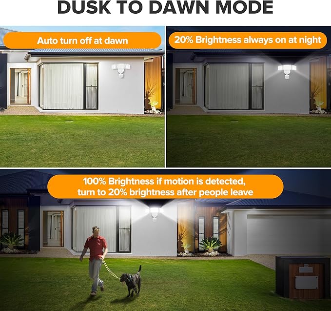 - 【4 LIGHTING MODES】: The outdoor flood lights features 4 versatile lighting modes to meet your different needs: ① 100% brightness when motion is detected at night; ② Maintains 20% brightness at night, up to 100% brightness with motion activated; ③ 6 hours constant illumination, 100% brightness day or night; ④ Test Mode. Suitable for the porch, garage, backyard, driveway, walkway, front door, etc