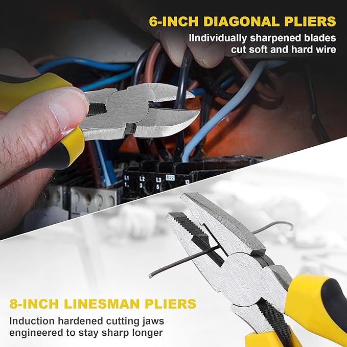 - Basic Sizes of 6-Piece Pliers Set: Includes 10” groove joint pliers, 10” slip joint pliers, 8” linesman pliers, 8” long nose pliers, 8” adjustable wrench and 6” diagonal pliers. This pliers set is perfect for daily home use, automotive work and diy projects.