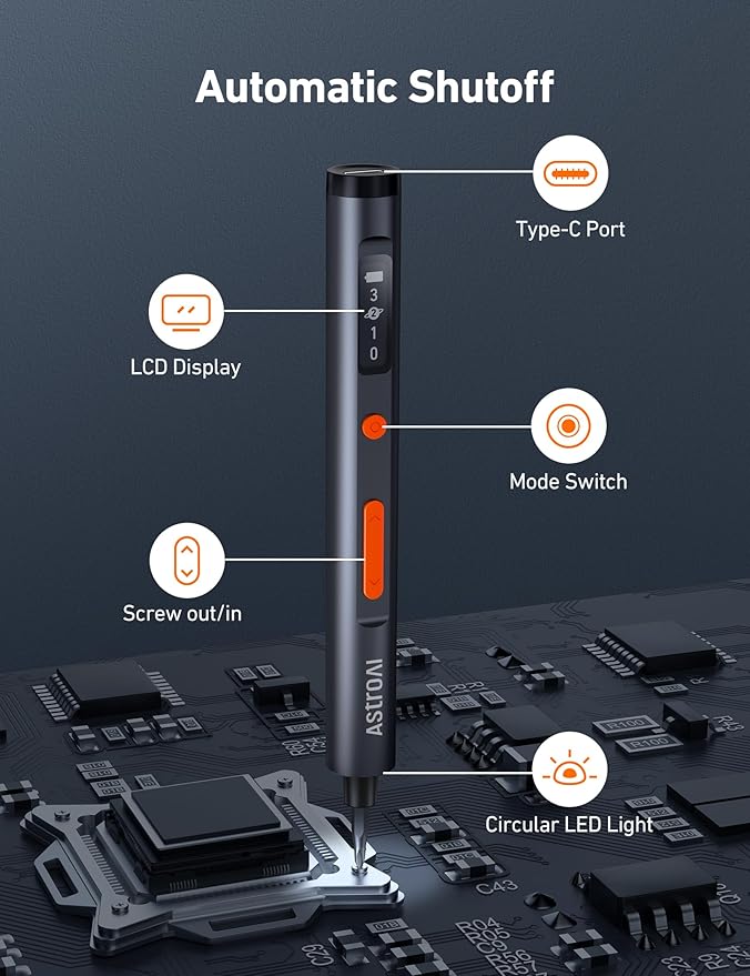 - Precisely-Crafted Design: Our pen-style mini electric screwdriver is powerful, yet easy to carry. It features an LCD display screen that allows you to adjust torque and check the battery level in real time. Experience the convenience of true hassle-free screw tightening and loosening, just by switching it On/Off with the arrow button. The included 4 ultra-bright LED lights ensure you can always work, even in dimly-lit areas; this makes it ideal for working on computers or other precision instruments.