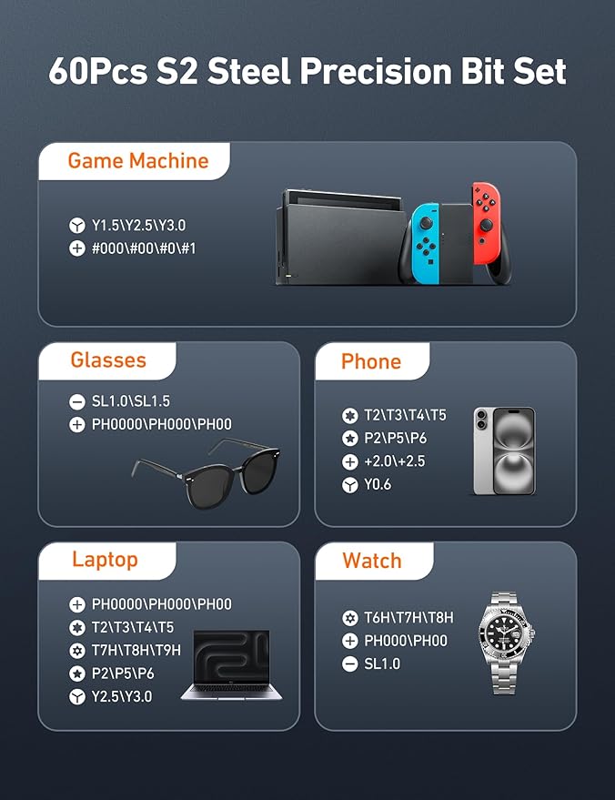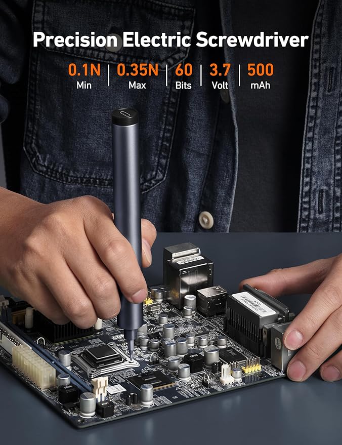 - What’s in the Box: 1 x Mini Electric Screwdriver, 1 x Storage Box, 60 x Precision Bits, 1 x Magnetizer, 1 x Pry Bar, 1 x Tweezer, 1 x USB Type-C Charging Cord, 1 x User Manual.