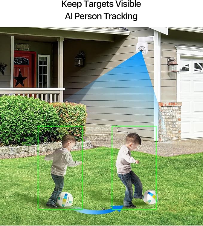 - (3). [ Full Coverage Pan/Tilt & Human Auto Tracking ]__ Featuring a remarkable 355° horizontal rotation and 95° vertical tilt, this pan/tilt camera delivers full coverage, leaving no blind spots. Its intelligent human auto-tracking capability allows the camera to seamlessly follow and record movement, ensuring maximum security for your home and loved ones.