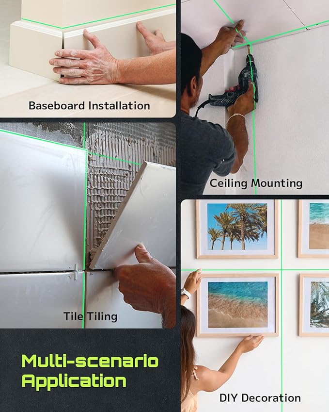 - Ample Full Coverage: The device provides 4x360 laser coverage. The top horizontal line is ideal for ceiling installations, while the bottom line is for floor tiling, meeting professional precision needs. With 16 green laser lines for enhanced visibility, making it suitable for both professional and home use. Complies with Class II safety standards, with a power output of less than 1mW